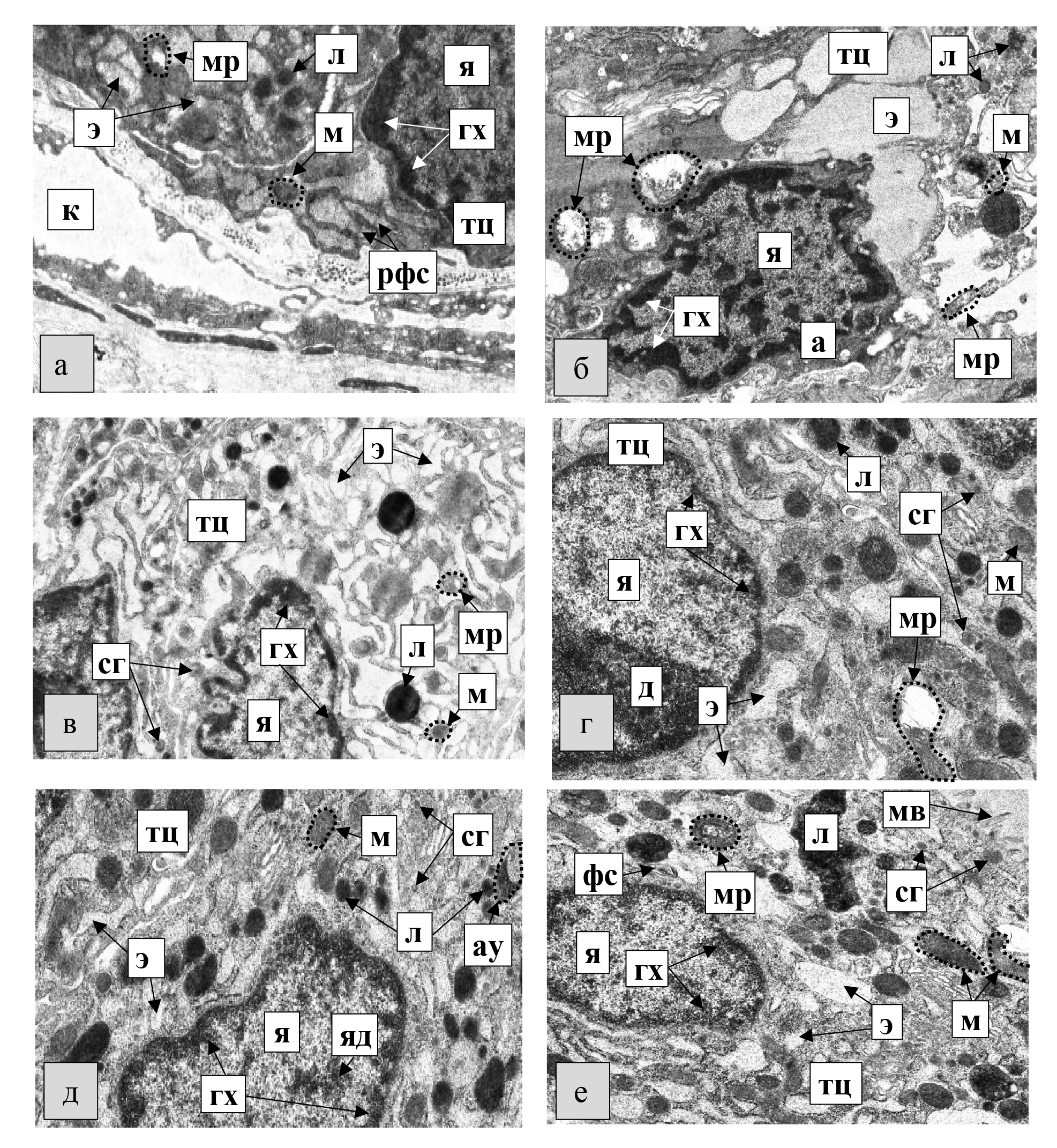 Рисунок 1. Электронно-микроскопические особенности тироцитов щитовидной железы половозрелых крыс на третьи сутки эксперимента (а – группа 1БНД, б – группа 2БНД, в – группа 1БНД+М, г – группа 2БНД+М, д – группа 1БНД+С, е – группа 2БНД+С): тц – тироцит, я – ядро, гх – гетерохроматин, д – гетерохроматин в виде дорожки, яд – ядрышко, э – гранулярная эндоплазматическая сеть, м – митохондрии, мр – митохондрии с разрушенным участком, л – лизосомы, ау – аутофагосома, сг – секреторные гранулы, мв – микроворсинка, к – капилляр, рфс – рыхло расположенные фибриллярные структуры в полости цистерны гранулярной эндоплазматической сети, фс – концентрически скрученные фибриллярные структуры в полости цистерны гранулярной эндоплазматической сети, а – клетка с признаками апоптоза. Ув.×8000.