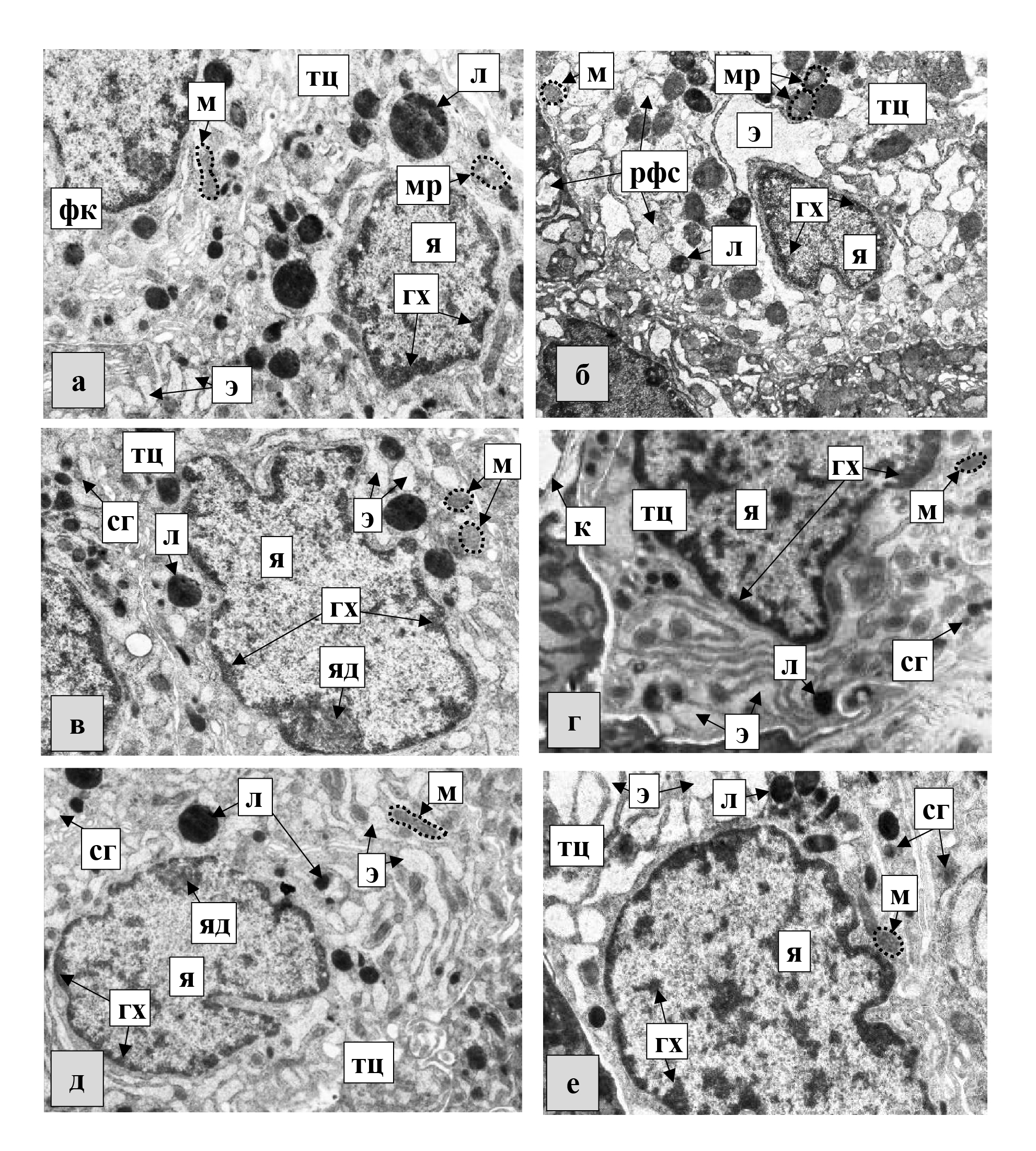 Рисунок 2. Электронно-микроскопические особенности тироцитов щитовидной железы половозрелых крыс на 24-е сутки эксперимента (а – группа 1БНД, б – группа 2БНД, в – группа 1БНД+М, г – группа 2БНД+М, д – группа 1БНД+С, е – группа 2БНД+С): тц – тироцит, я – ядро, гх – гетерохроматин, яд – ядрышко, э – гранулярная эндоплазматическая сеть, м – митохондрии, мр – митохондрии с разрушенным участком, л – лизосомы, сг – секреторные гранулы, к – капилляр, рфс – рыхло расположенные фибриллярные структуры в полости цистерны гранулярной эндоплазматической сети. Ув.×8000.