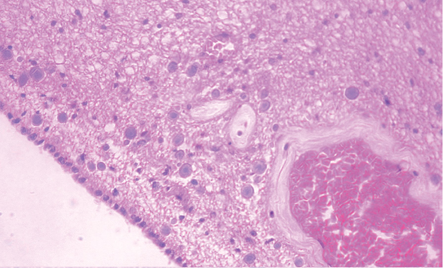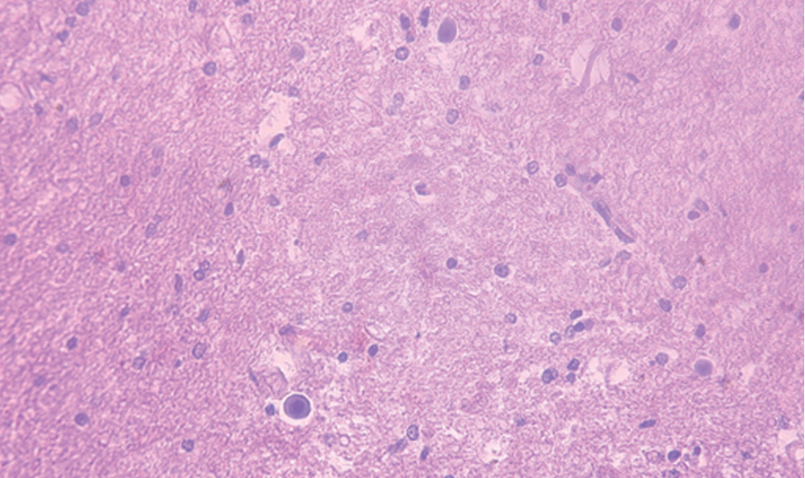 Забор аутопсийного материала осуществляли в области предцентральной извилины коры большого мозга, в мозолистом теле в областях валика и колена мозолистого тела. Кусочки фиксировали в 10% растворе забуференного по Лилли формалина (рН – 7,2) в течение 24 ч. Материал промывали в проточной воде в течение 30 мин, а затем подвергали обезвоживанию и заливке в парафин по схеме: спирт 60% – 2 ч, спирт 70% – 2 ч, спирт 96% – 2 ч, спирт 96% – 2 ч, спирт + ксилол (1:1) – 2 ч, ксилол + парафин (1:1) – 2 ч, парафин I 56° – 2 ч, парафин II 56° – 1 ч. После заливки кусочков в парафиновые блоки на ротационном микротоме изготавливали гистологические срезы толщиной 4–6 мкм. Срезы окрашивали гематоксилином и эозином.