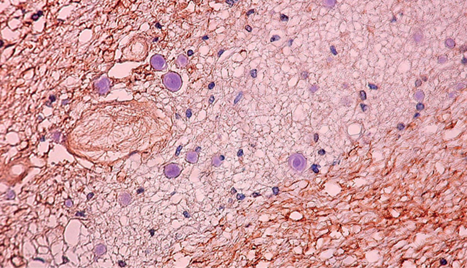 Рисунок 4. Фрагмент мозолистого тела мужчины 72 лет. Скопления микроглиоцитов разного диаметра вблизи сосуда. Экспрессия белка нейрофиламентов снижена в местах скоплений микроглиоцитов. Увеличение 100.