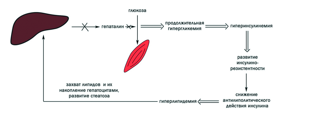 В норме после приема пищи вместе с инсулином печенью выделяется гормон гепаталин, отвечающий за повышение чувствительности к инсулину в основном мышечной ткани. При нарушениях выделения гепаталина возникает пролонгированная постабсорбтивная гипергликемия с компенсаторной гиперинсулинемией и гиперлипидемией [18]. Глюкотоксический и липотоксический эффект на гепатоциты был рассмотрен выше.