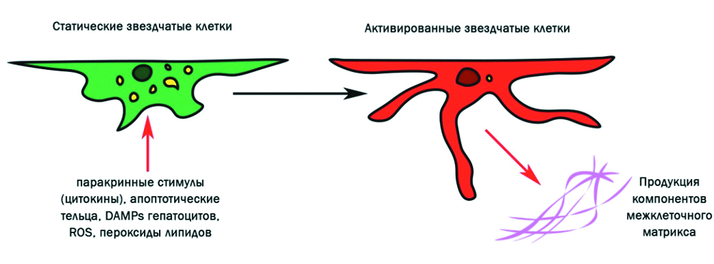 Основную роль играют печеночные причины ПГ. Цирроз печени, фиброз печени, стеатогепатит, вирусный гепатит являются хроническими заболеваниями, приводящими к увеличению сопротивления внутрипеченочных сосудов и развитию ПГ [5]. Увеличение сопротивления на постсинусоидальном участке печеночной вены связано с сокращением миофибробластов и фиброзом, сужающим просвет синусоидов. Основную роль в фиброзе играют звездчатые клетки, находящиеся в перисинусоидальном пространстве и в норме депонирующие жирорастворимые витамины. При острых и хронических воспалительных процессах звездчатые клетки активируются при взаимодействии с веществами, выделенными поврежденными гепатоцитами, апоптотическими тельцами и реактивными видами кислорода (ROS), и дифференцируются в миофибробласты, пролиферирующие, мигрирующие в направлении хемоаттрактантов и продуцирующие компоненты внеклеточного матрикса [6].
