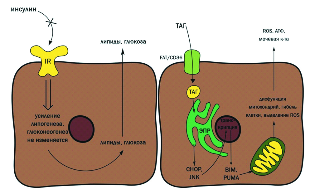 Увеличение количества жировой ткани, в особенности висцеральной, ассоциировано с риском развития инсулинорезистентности [14]. Инсулинорезистентность способствует развитию ПГ на локальном (печеночном) и системном уровнях. Инсулин стимулирует продукцию NO эндотелием сосудов печени, активируя сигнальный путь фосфатидилинозитол-3-киназы и серин-треониновой киназы (PI3K/Akt). Последующее уменьшение продукции NO вызывает дисфункцию эндотелия капилляров [15]. В условиях инсулинорезистентности уменьшается антилиполитическое действие инсулина, что приводит к гиперлипидемии, то есть к увеличению концентрации свободных жирных кислот (СЖК) в крови. За счет повышенной экспрессии транслоказы жирных кислот (FAT/CD36) гепатоциты захватывают СЖК, из которых образуют триглицериды, накапливающиеся в гепатоцитах и усугубляющие стеатоз паренхимы органа. Жирные кислоты, в особенности ненасыщенные, при их избытке накапливаются в эндоплазматическом ретикулуме гепатоцитов, вызывая активацию проапоптотического фактора транскрипции CHOP и фермента JNK, которые индуцируют синтез проапоптотических белков BIM и PUMA, способствующих дисфункции митохондрий, образованию активных форм кислорода. Такое воздействие не только вызывает гибель клетки, но и негативно влияет на микростромальное окружение [16]. Инсулинорезистентность в печени имеет селективный характер: действие инсулина не замедляет глюконеогенез, но при этом стимулирует липогенез [17], приводя к повышенному синтезу эндогенных жирных кислот, в основном пальмитиновой кислоты, что увеличивает концентрацию ненасыщенных СЖК в гепатоците и их токсическое действие на функционирующую паренхиму.