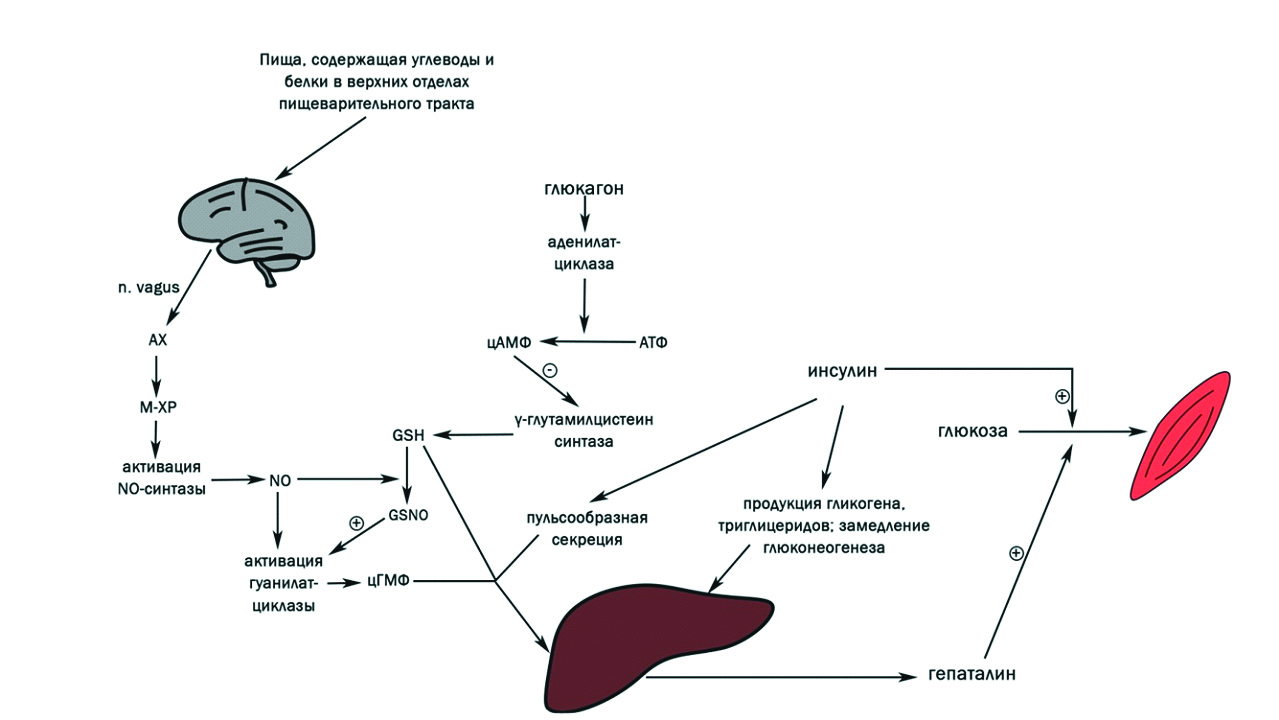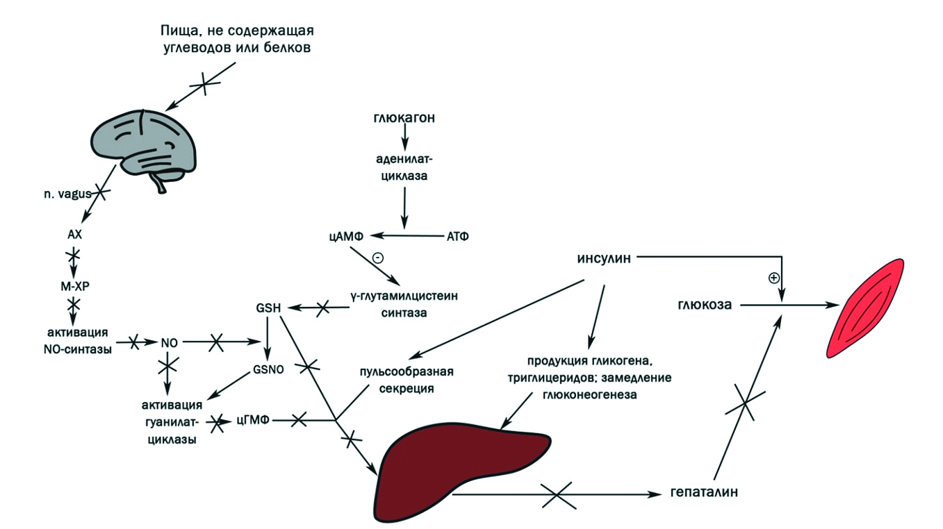 В печени выброс гепаталина вызывается при одновременном действии трех стимулов: парасимпатического воздействия на печень через блуждающий нерв, достаточного уровня печеночного глутатиона и пульсообразного повышения концентрации инсулина (рисунок 1). Гепаталин является синергистом инсулина, выделяемым в норме после полноценного приема пищи. В присутствии гепаталина усвоение глюкозы усиливается на 67% [19], при этом гепаталин действует на скелетные мышцы, почки, сердце, но не на печень или жировую ткань, стимулируя в них поглощение глюкозы и синтез гликогена [20, 21]. Парасимпатический сигнал выделяется в ответ на появление в желудке пищи, содержащей одновременно и белки, и углеводы, при этом отдельное введение белков, жиров или углеводов не вызывало образование сигнала [22]. Уровень печеночного глутатиона повышается на 40–50% после приема пищи, что достаточно для выделения гепаталина в присутствии двух оставшихся стимулов. При этом блокирование образования NO введением атропина для ингибирования М-холинорецепторов или ингибированием NO-синтазы привело к снижению выделения гепаталина. Предположительно это связано с тем, что NO посредством активации гуанилатциклазы стимулирует выделение гепаталина [23]. Повышение уровня глюкагона в период голодания понижает уровень печеночного глутатиона, что приводит к отсутствию выделения гепаталина в ответ на инсулин (рисунок 2).