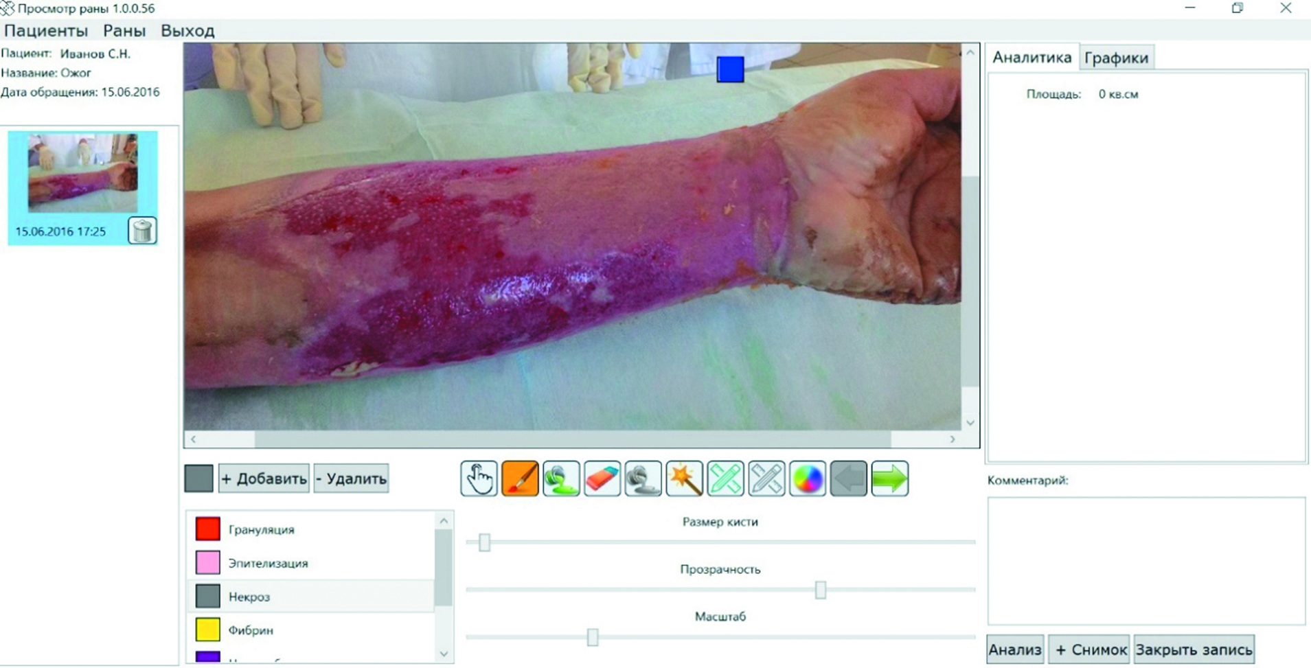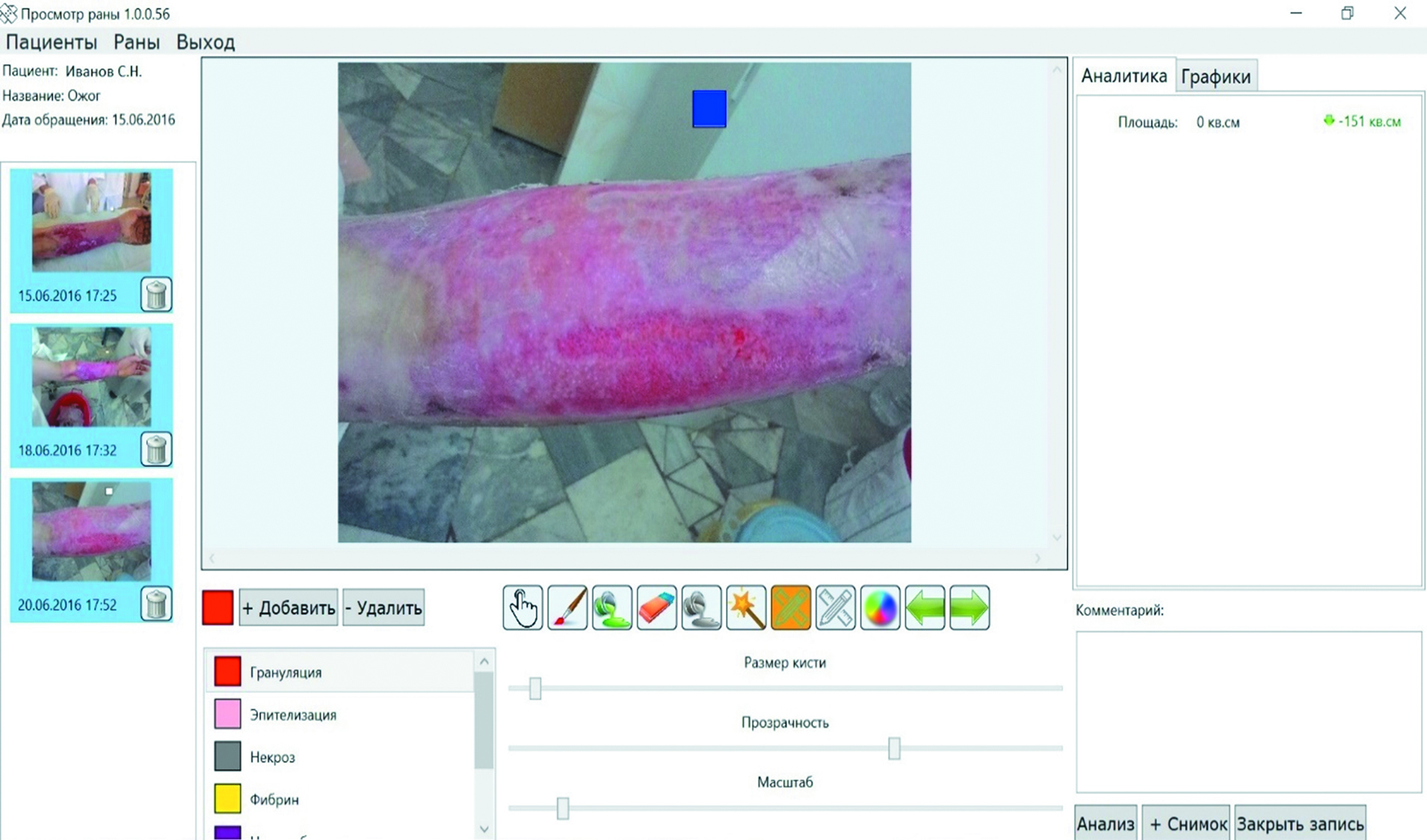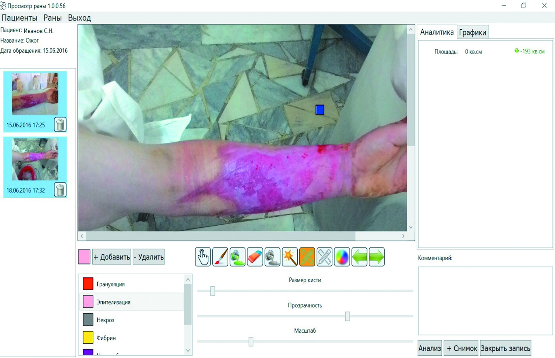 The monitoring of the burn wound healing was performed using the “Complex automated system for assessing the area of burn wounds” (certificate of state registration of the computer program No. 2015660700 dated 10/06/2015). The technology involves computer-assisted processing of wound area photographs. A wound surface image is uploaded to a computer system, where specialized software determines the wound boundaries and calculates its area. Additionally, the software analyzes healing progression through dynamic assessment of color gradient changes across the wound surface.