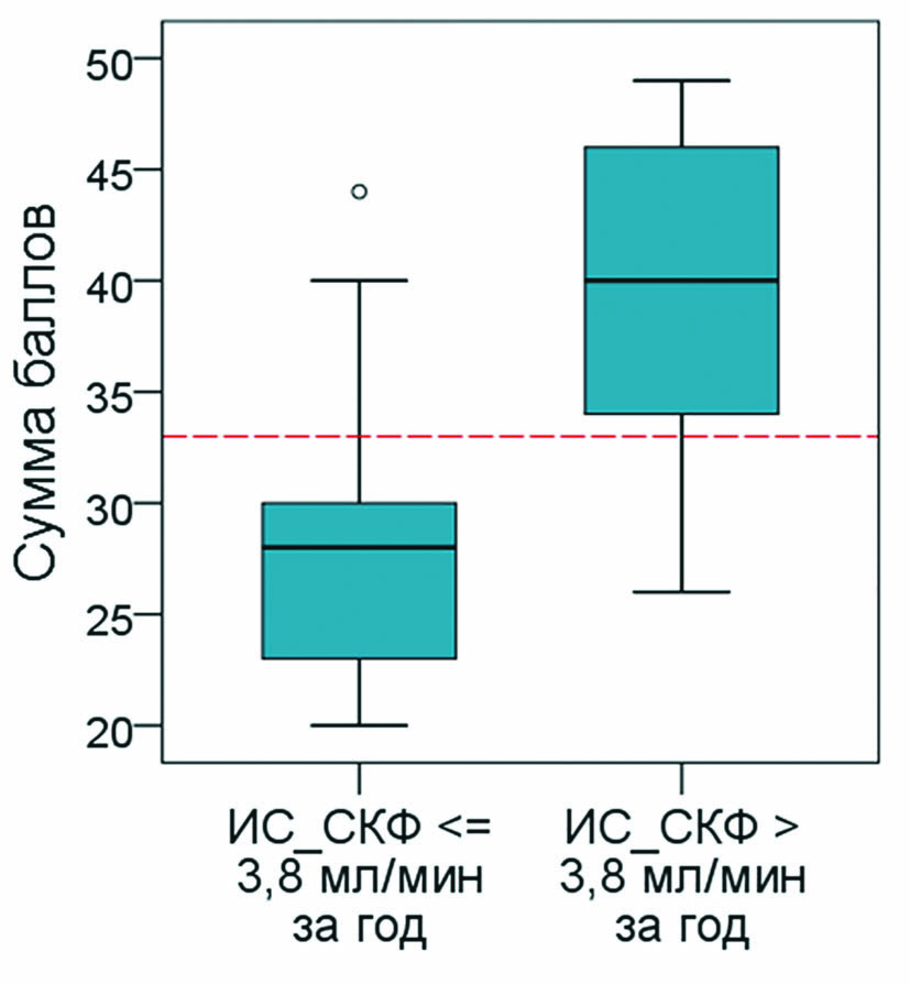 При определении суммы баллов у конкретного больного СД 2 типа полученное значение соответствует персональному риску прогрессирования ХБП с ИС_СКФ > 3,83 мл/мин/1,73м2 за год. Характеристики шкалы: предельные значения от 20 (минимальный балл) до 54 (максимальный балл); при условии бинарной функции прогноза («быстрое» / «медленное» прогрессирование ХБП) существенное значение имеет отрезная точка (cut off) 33 балла, при превышении значения которой риск быстрого прогрессирования ХБП считается высоким.