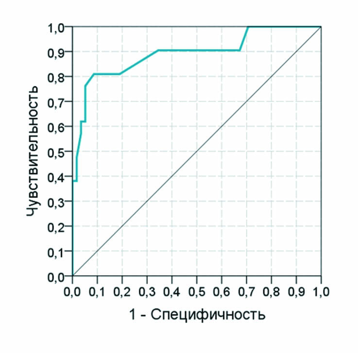 При оценке площади под ROC-кривой AUC получено значение 0,89 (0,80; 0,99) р < 0,001, что свидетельствует о высокой диагностической значимости предложенного калькулятора. Соотношение приемлемых параметров чувствительности сопряжено с сохранением достаточно высокой специфичности, что формирует характерную ступенчатую форму кривой (рисунок 2).