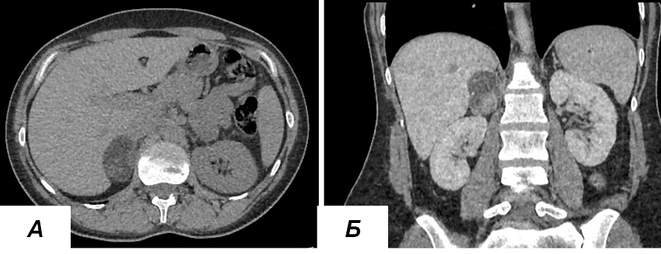 Рисунок 1. МСКТ брюшной полости и забрюшинного пространства у больной с новообразованием правого надпочечника с сочетанной продукцией альдостерона и кортизола (нативная фаза): а – аксиальная плоскость, б – корональная плоскость.