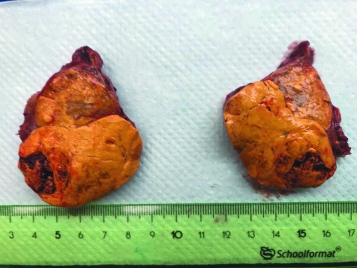 Рисунок 2. Макропрепарат (на разрезе) правого надпочечника с узловыми образованиями, исходящими из коркового слоя железы с сочетанной альдостерон-кортизол секрецией.