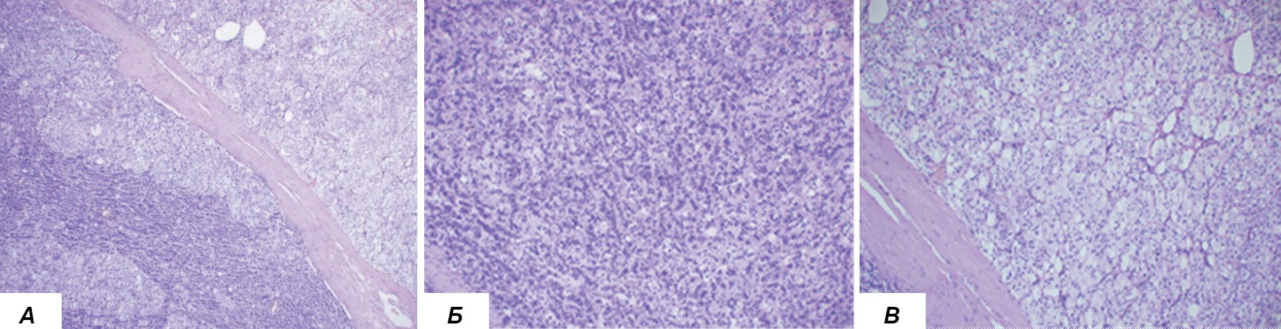 Рисунок 3. Адренокортикальная аденома с сочетанной секрецией альдостерона и кортизола. А. Фрагмент опухоли смешанного строения: крупные клетки с вакуолизированной светло-эозинофильной цитоплазмой (в верхнем правом углу) и клетки среднего размера с темной базофильной цитоплазмой (в нижнем левом углу). Б. Фрагмент опухоли, состоящий из клеток с темной базофильной цитоплазмой. В. Фрагмент опухоли, состоящий из клеток со светло-эозинофильной цитоплазмой.