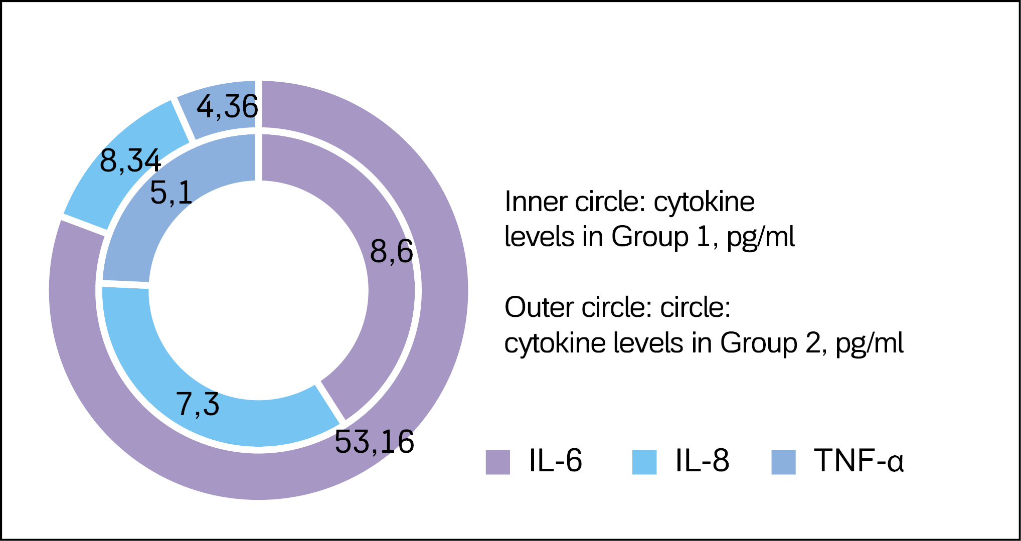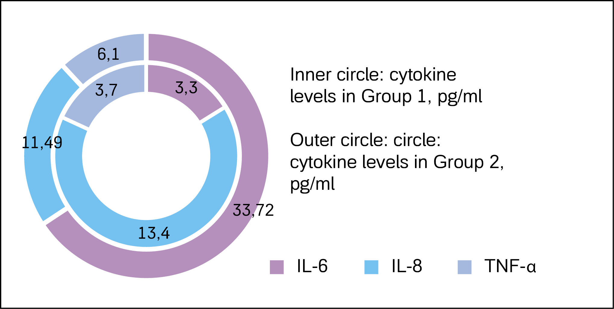 In all of the examined individuals, markers of cellular immunity were identified (CD-3, CD-4, CD-8, CD-19) by immunofluorescence using monoclonal antibodies from “Sorbent” (Moscow); phagocytic index and phagocytic index in relation to St. aureus, metabolic activity of segmented neutrophils in spontaneous and induced reaction with nitroblue tetrazolium dye (NBT test); levels of A, M, G immunoglobulins in the immunodiffusion reaction, as well as content of circulating immune complexes (CIC) in a precipitation reaction with polyethyleneglycol, cytokines IL-6, IL-8, TGF-β, TNF-α by enzyme immunoassay (EIA) using test systems from “Vector Best”. To identify a possible relationship between qualitative characteristics, the Pearson coefficient was determined; between quantitative and qualitative characteristics, the methods of group and one-factor variance analysis with the determination of the F-test, the Kruskal-Wallis test was used. Methods of multivariate statistics were used, namely descriptive statistics. Statistical processing of the obtained results was carried out using Statistica 10.0 software suite.