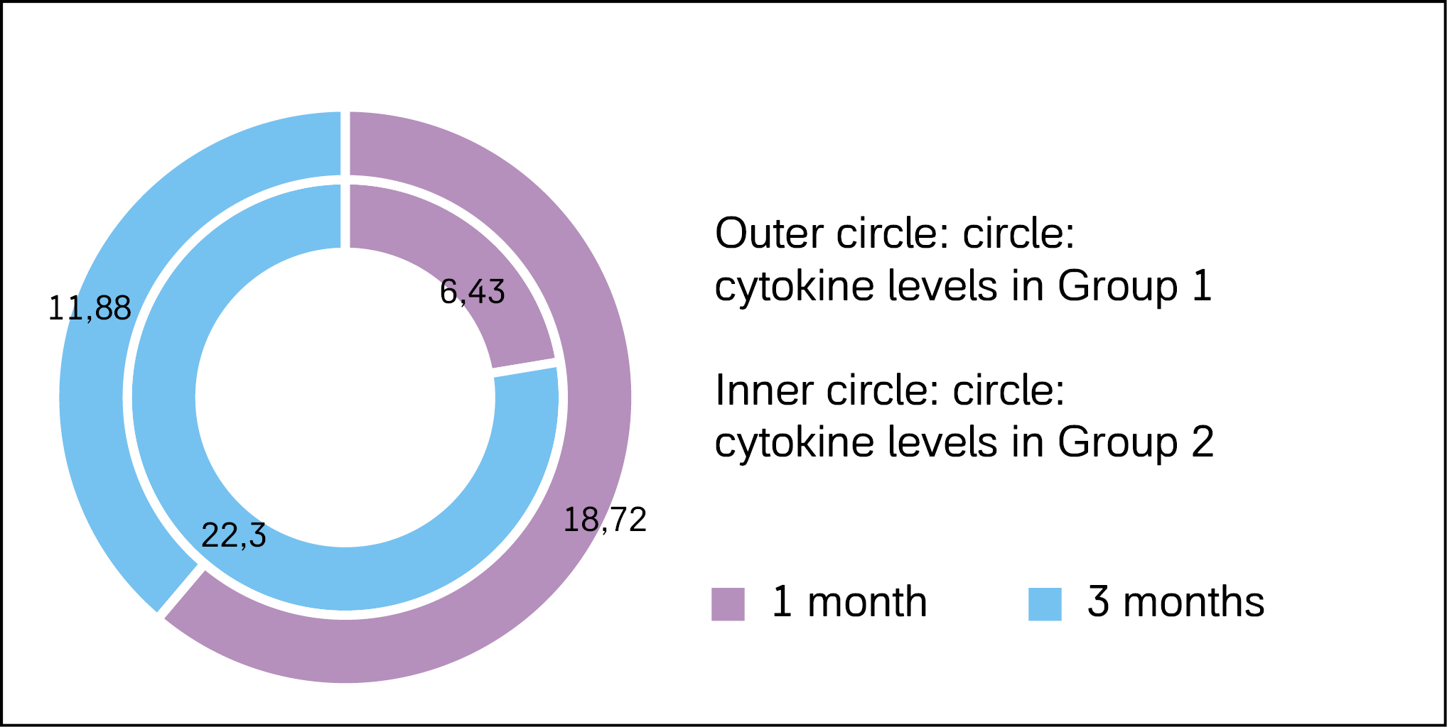 The analysis of the cytokines revealed various changes (Fig. 3, 4). In the first group, the changes only appeared three months after the recovery (increase of the IL-8). In the patients of the second group, the increase of the IL-6 was seen one month past the infection despite the implementation of targeted therapy. In three months, an increase of the IL-8 and TGF-β was observed (Fig. 5).