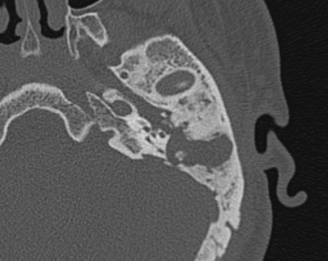 Рисунок 3. КТ левой височной кости пациента через 12 месяцев после проведения оперативного вмешательства. Послеоперационная полость без патологического содержимого. Признаки рецидива холестеатомы и экструзии электрода отсутствуют.
