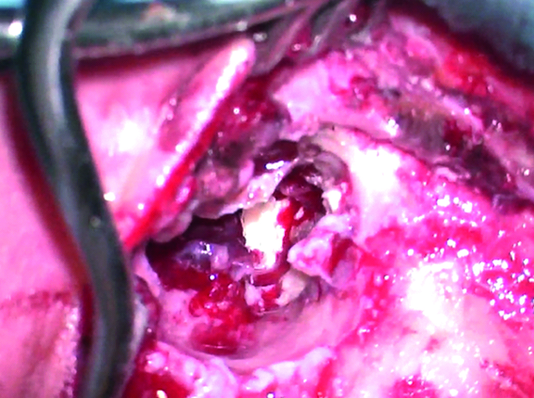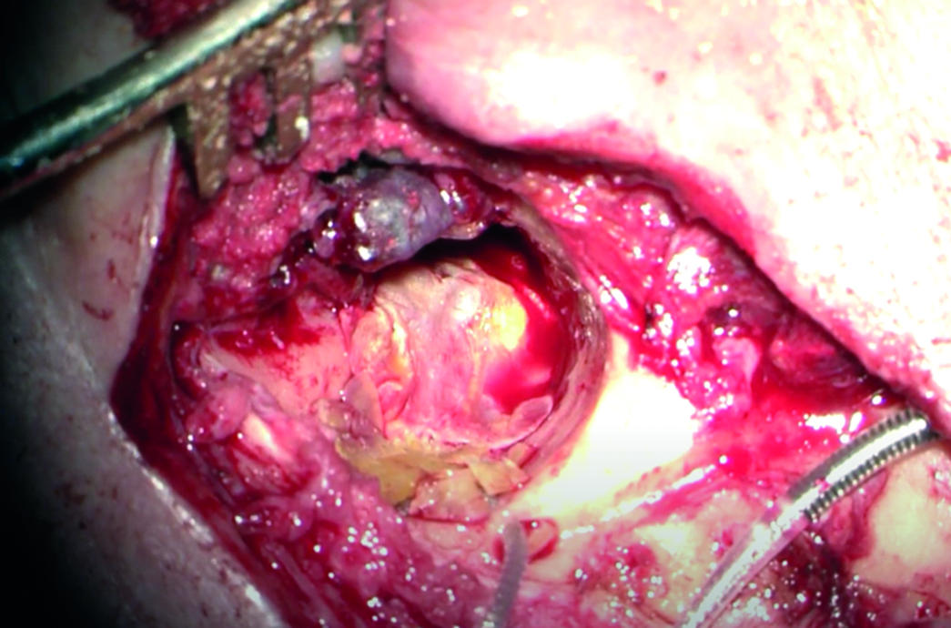 Figure 2. Intraoperative photo of the patient with the exposed antromastoid cavity on the left, where a fragment of a cholesteatoma is visualized.