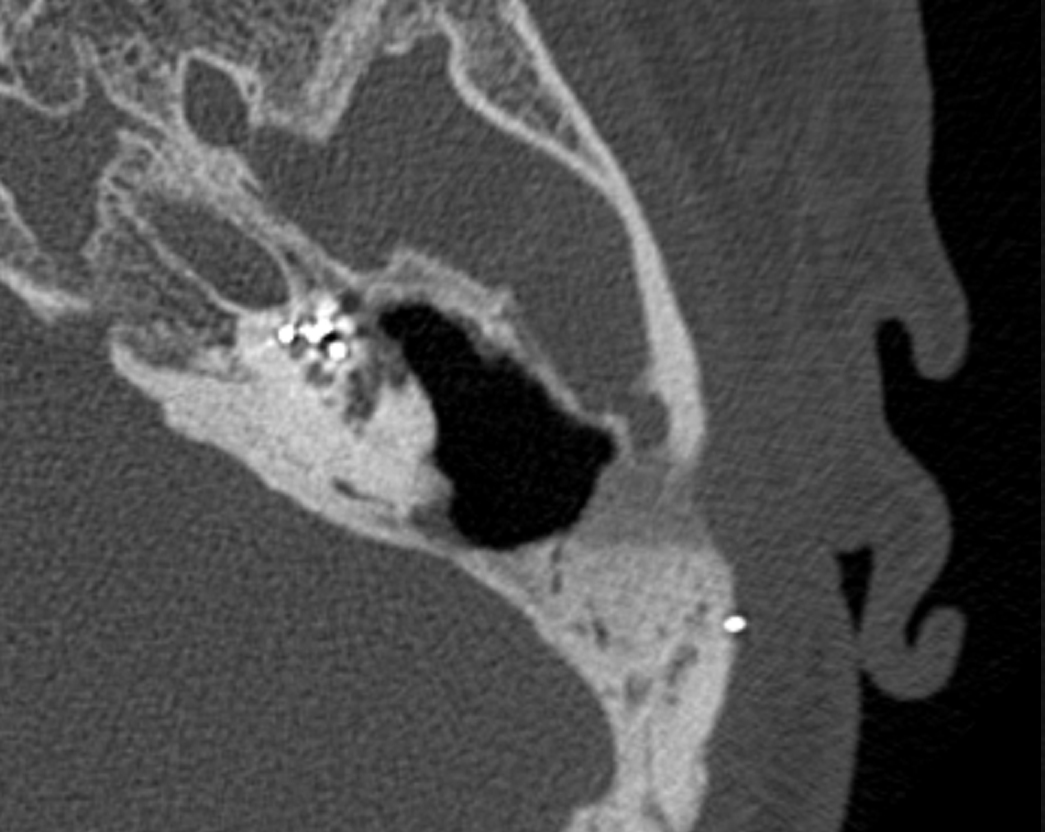 One year after the surgery the patient presented a computed tomography (CT) scan of the temporal bones (Fig. 3). The postoperative cavity is clean with no pathological mass. No relapse of the choleteastoma or electrode extrusion were identified.