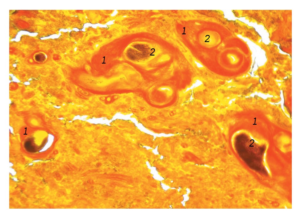Figure 2. Group arrangement of villi. Middle zone of the placenta in the central part. Histotopogram. Photos under the microscope MX-1150 (T). Magnification: lens 2.0, eyepiece 10. Van Gieson staining. 1 – intermediate villi; 2 – villous vessels.
