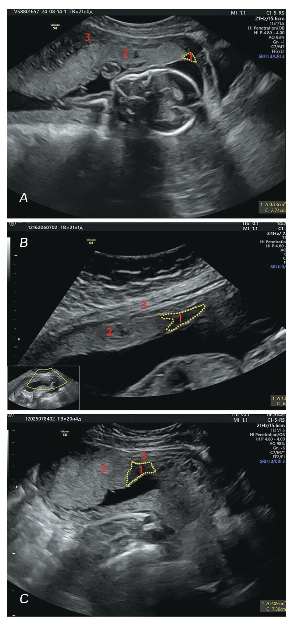 Рисунок 4. Различные формы среза краевого синуса. Ультразвуковая сканограмма плаценты в В-режиме. А – треугольный, гестационный возраст 20 недель 6 дней; B – стреловидный, гестационный возраст 21 неделя 1 день, C – неправильный, гестационный возраст 20 недель 4 дня. 1 – краевой синус; 2 – плацента; 3 – стенка матки.