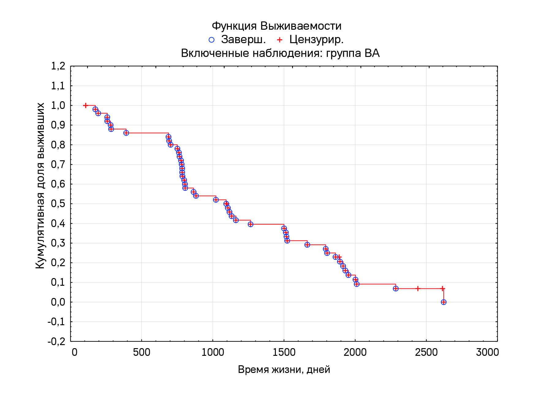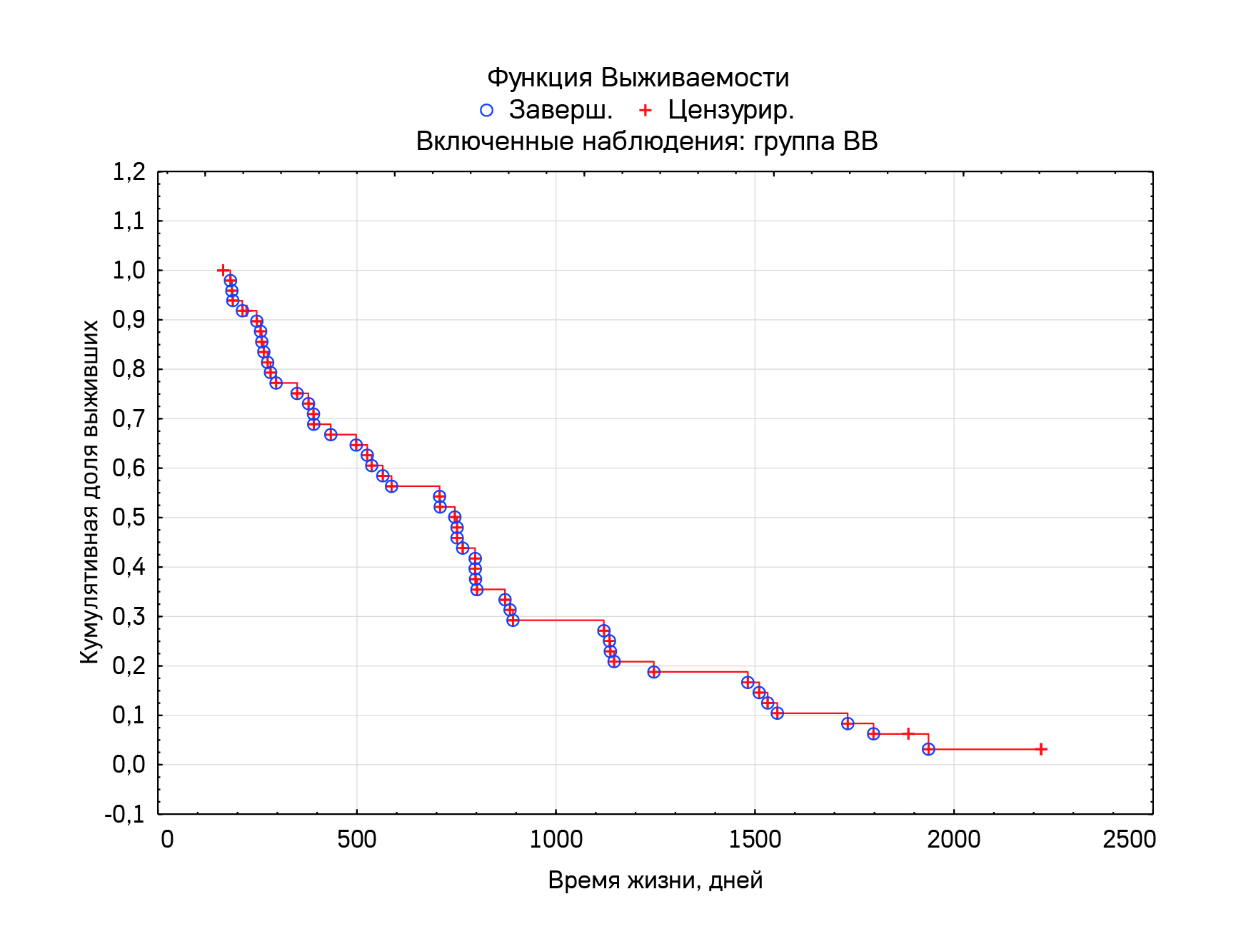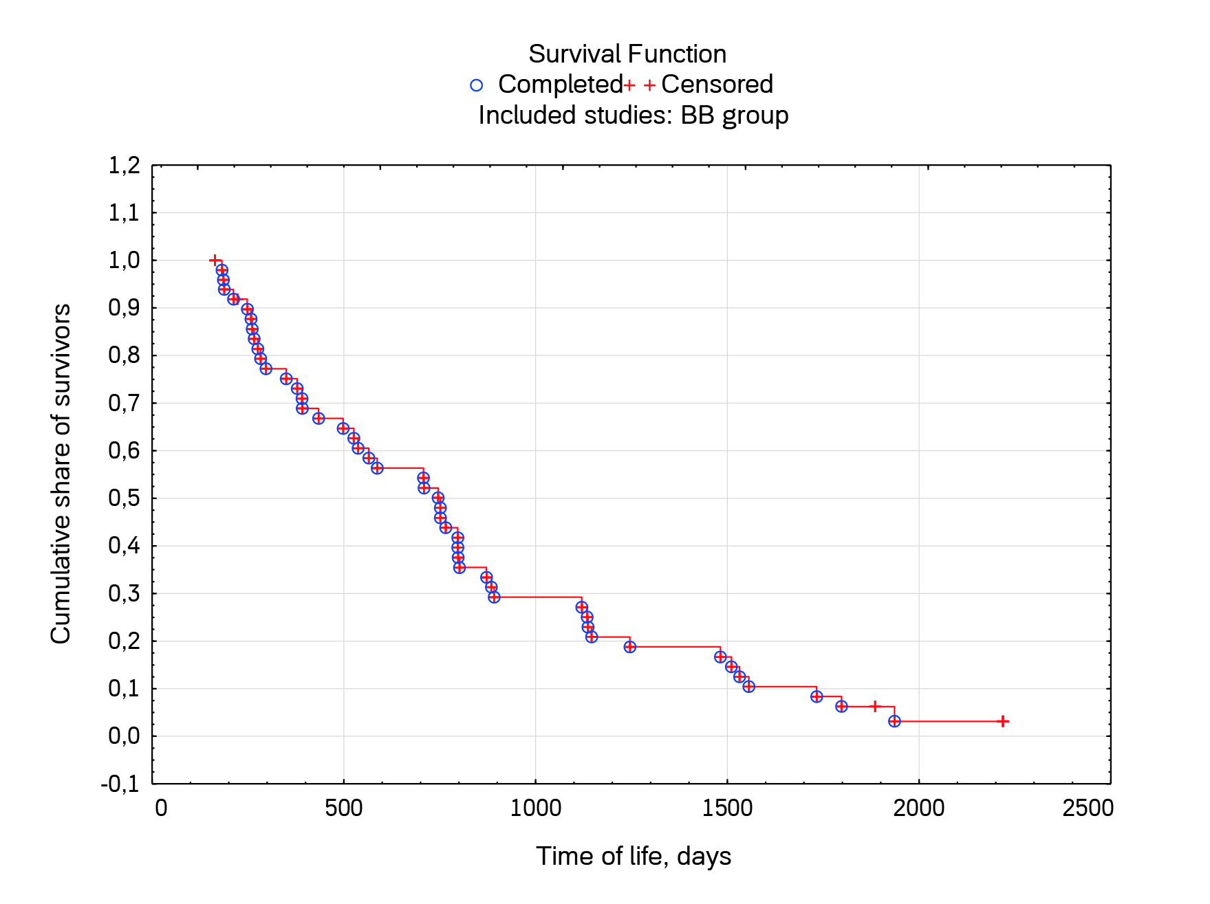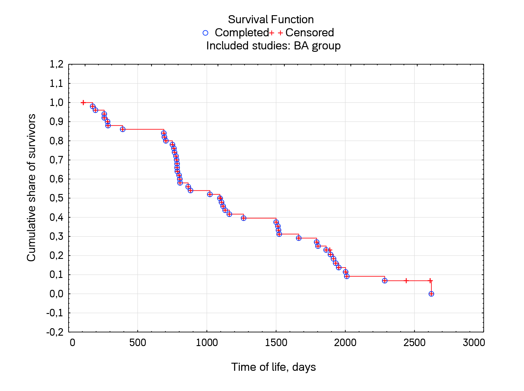 In the calculation of survival and average life expectancy, the survival curve method was used. For a more detailed analysis of the degree of difference in survival curves, several tests were used: log-rank, Gehan-Wilcoxon, Cox, Cox-Mentel, Wilcoxon-Peto.