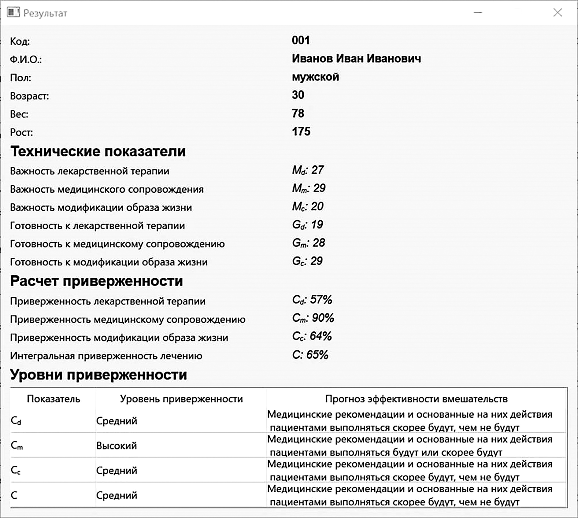 Results. The program allows the user to evaluate 6 technical indicators calculated using formulas: importance of drug therapy, importance of medical support, importance of lifestyle modification, readiness for drug therapy, readiness for medical support, readiness for lifestyle modification. Calculation using integrated formulas also allows the user to display the result of the commitment calculation on the user’s screen in four aspects: 1) commitment to lifestyle modification, 2) commitment to drug therapy, 3) commitment to medical support, 4) integral commitment to treatment. After the end of testing, the program saves the patient’s answers to an Excel file located in the root folder of the program in the form of percentages, which are generated depending on the patient’s response in accordance with the classical algorithm for interpreting the results of the questionnaire using integrated formulas.