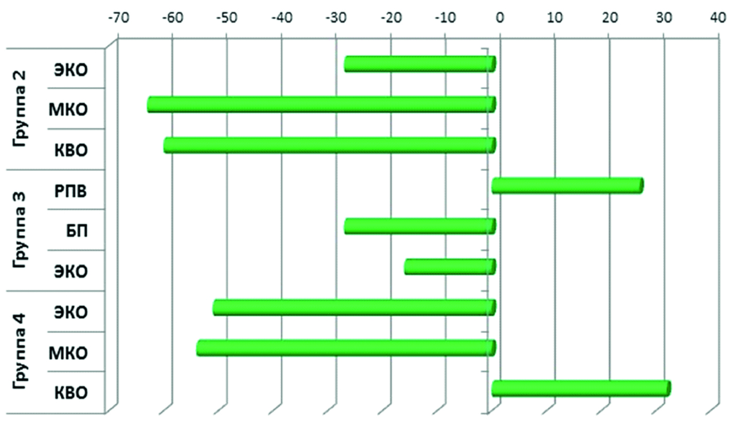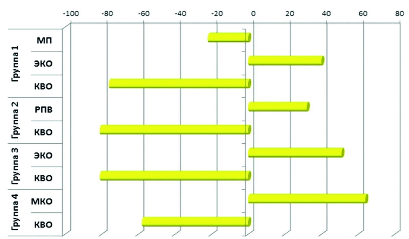 Исследования гемодинамики МКК продемонстрировали изменения показателя работы сосудистого русла во всех группах (рисунок 2). Наиболее значительные нарушения гемодинамики МКК зарегистрированы в группе 1. Так, отмечено уменьшение показателя работы в фазу МП на 22% (р=0,036), при этом сосуды легочного круга кровообращения стремились компенсировать это нарушение увеличением работы на 40% (р=0,0001) в фазу ЭКО, однако динамика данного показателя в фазу КВО в виде снижения на 76% (р=0,0001) демонстрирует нарушение оттока крови из сосудистого русла легких. В группе 2 отмечено снижение работы в фазу КВО на 81% (р=0,007), что компенсируется увеличением данного показателя на 32% (р=0,039) в фазу РПВ. В группах 3 и 4 зарегистрированы схожие нарушения гемодинамики МКК. В фазу КВО наблюдалось снижение работы сосудистого русла на 81% (р=0,005) и 58% (р=0,002) в группах 3 и 4 соответственно. Также в группе 3 отмечено повышение работы в фазу ЭКО на 51% (р=0,008) и в группе 4 – повышение данного показателя на 64% (р=0,008) в фазу МКО.