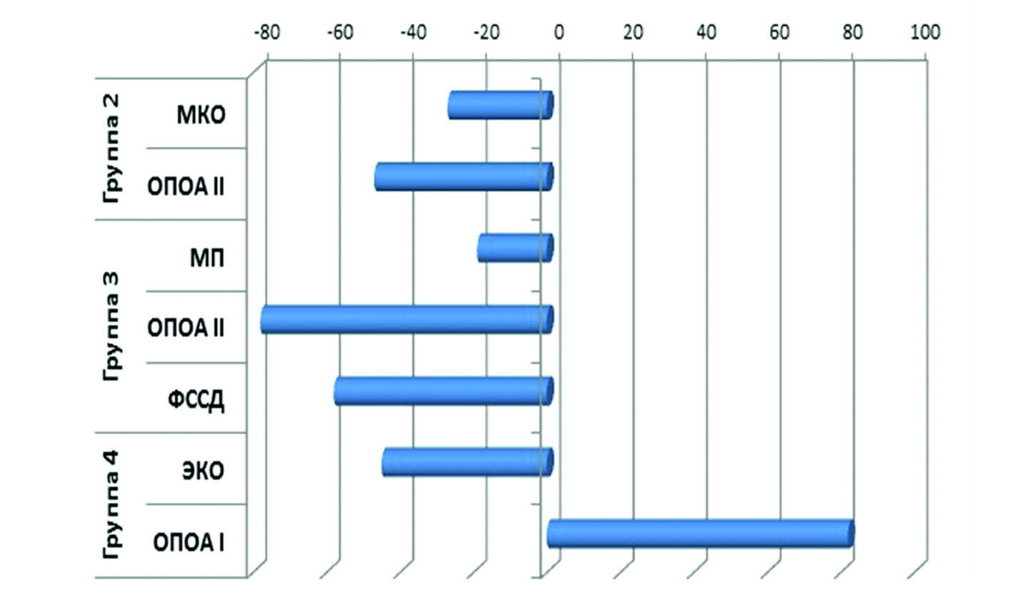 Отмечено снижение показателя работы в группе 2 в фазы МКО и ОПОА II на 27% (р=0,031) и 47% (р=0,027) соответственно. В группе 3 выявлено уменьшение работы в фазы МП, ОПОА II и ФССД на 19% (р=0,005), 78% (р=0,008) и 58% (р=0,033) соответственно. Полученные данные свидетельствуют о систоло-диастолической дисфункции, возникающей на периферических артериях нижних конечностей. В группе 4 наблюдалось снижение показателя работы на 45% (р=0,007) в фазу ЭКО и увеличение данного показателя на 82% (р=0,005) в фазу ОПОА I, что свидетельствует о компенсации нарушений кинетики стенки тыльной артерии стопы в систолу.