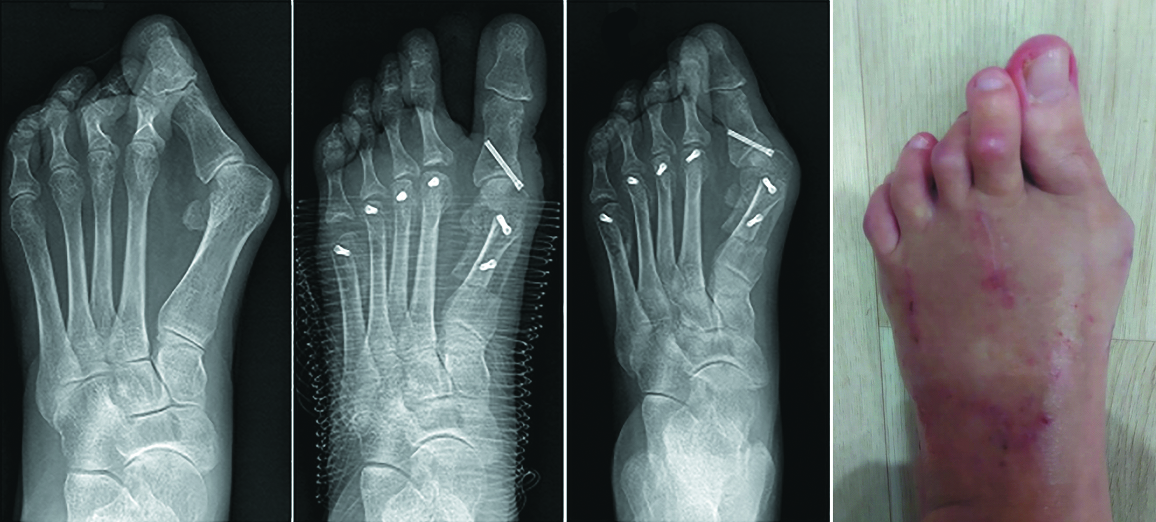 Figure 1. X-ray image before the JPS; immediately after the deformity was eliminated; 3 months after the JPS (recurrence of the deformity); the appearance of the foot 3 months after the operation.