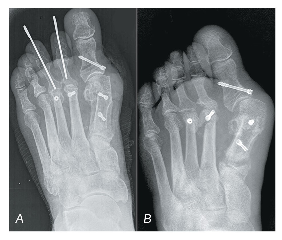 Рисунок 3. A – рентгенограмма сразу после ССО (остеотомии Scarf, Akin, Weil); B – рентгенограмма через 6 месяцев после ССО (асептический некроз головки второго ПК, нестабильность винта Герберта, рецидив вальгусной деформации первого пальца).