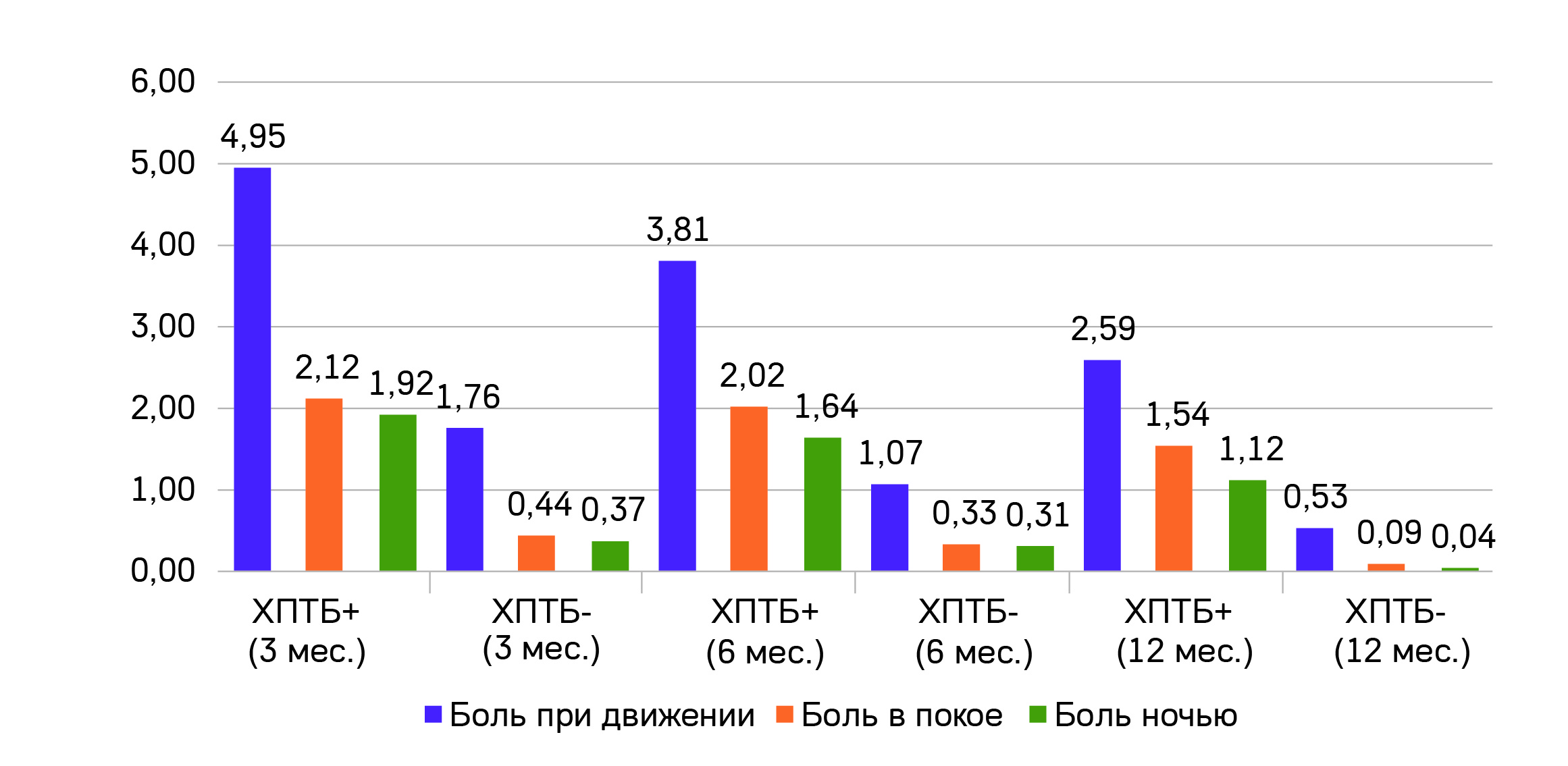 Рисунок 1. Динамика боли у пациентов с ХПТБ и без ХПТБ с 3 по 12 месяц наблюдения.