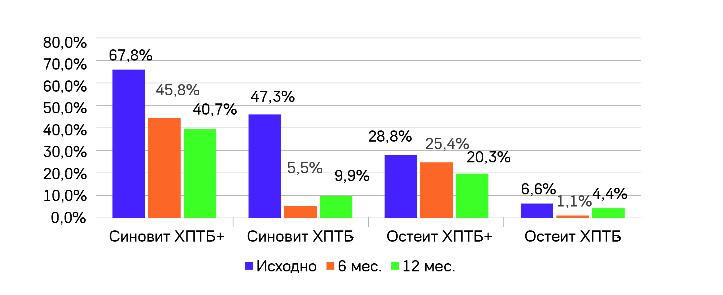Рисунок 2. Динамика синовита и остеита по данным МРТ в зависимости от наличия или отсутствия ХПТБ.