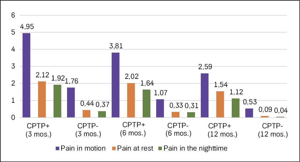 Figure 1. Pain dynamics in patients with and without CPTP from 3 to 12 months of follow-up.