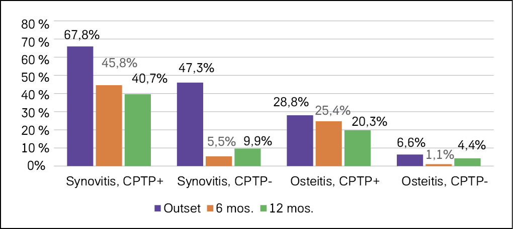 A correlation between the MRI-indicated signs of synovitis and osteoitis showing the persistent joint inflammation and the presence of CPTP was found. The data and the outcomes of recurrent MRI scans after 6 and 12 months showed statistically significant differences in the frequency of synovitis and osteoitis finding in the CPT+ group versus the CPTP- group (Fig. 2).