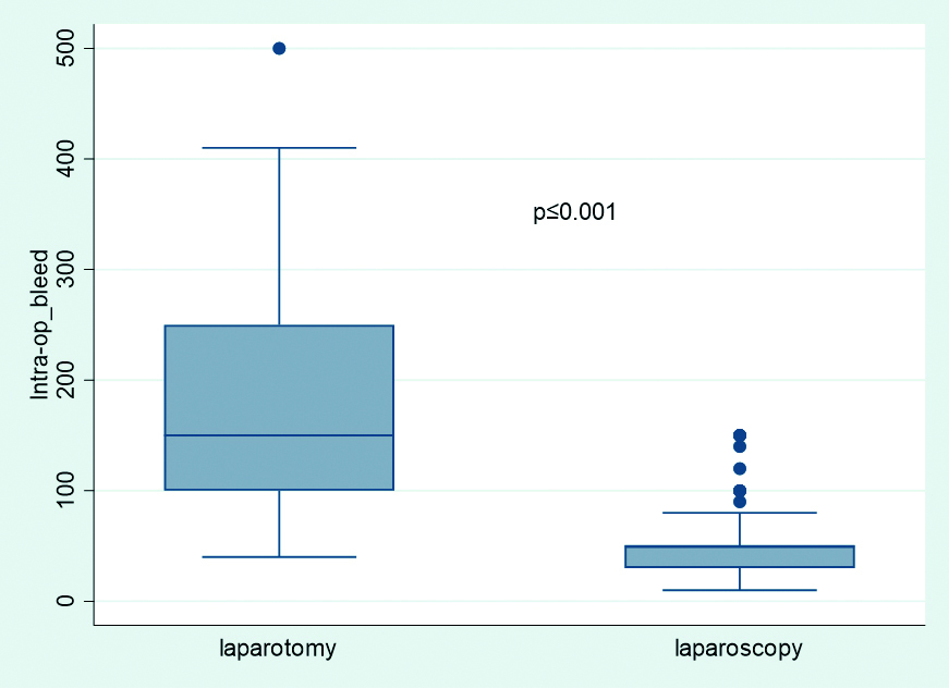 This fact confirms the advantages of the laparoscopic method known for its lower trauma and better visualization due to optical magnification. This allows for less intraoperative blood loss, which also contributes to faster recovery of patients [3, 13, 14].