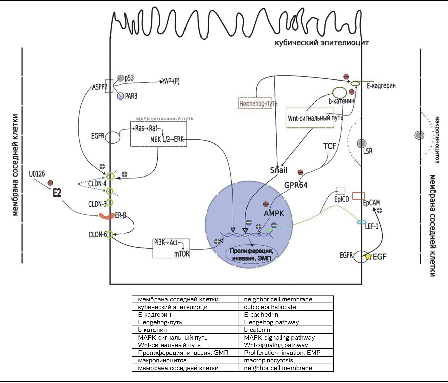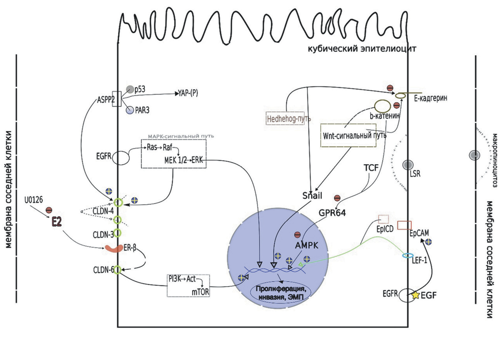 Epithelial cell adhesion molecule (EpCAM) is a membrane protein known to function as an mediator in the intercellular interaction and cell and intercellular matrix interaction. The current data as to the role of EpCAM hyperexpression are contradictory: on the one hand, EpCAM is supporting the normal histoarchitecture of epithelia, on the other hand, the adherens molecule might activate the intracellular pathways promoting cell invasion [23, 24]. Y.T. Hsu et al. (2016) report that the EpCAM integral protein is split into the extra- and intracellular domains (EpEX and EpICD, respectively) when induced by activated EGFR. The EpICD, subjected to nuclear translocation, together with the LEF-1 acts as activator of transcription of target genes responsible for epithelial-mesenchymal transformation [25].