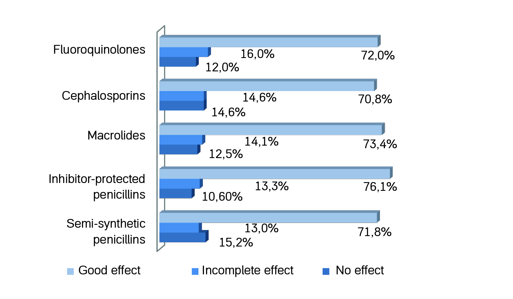 Regardless of the type of the antibacterial drug, 78 (69.0%) patients did not reach a positive clinical effect or it was incomplete and required adjustment of the scheme of therapy (increase of course duration, change of average daily dose, replacement or addition of a second antibacterial drug). Among the patients in whom a good clinical effect was reached in the treatment of exacerbation, no statistically significant variations were identified that would relate to the selection of a specific antibacterial drug.