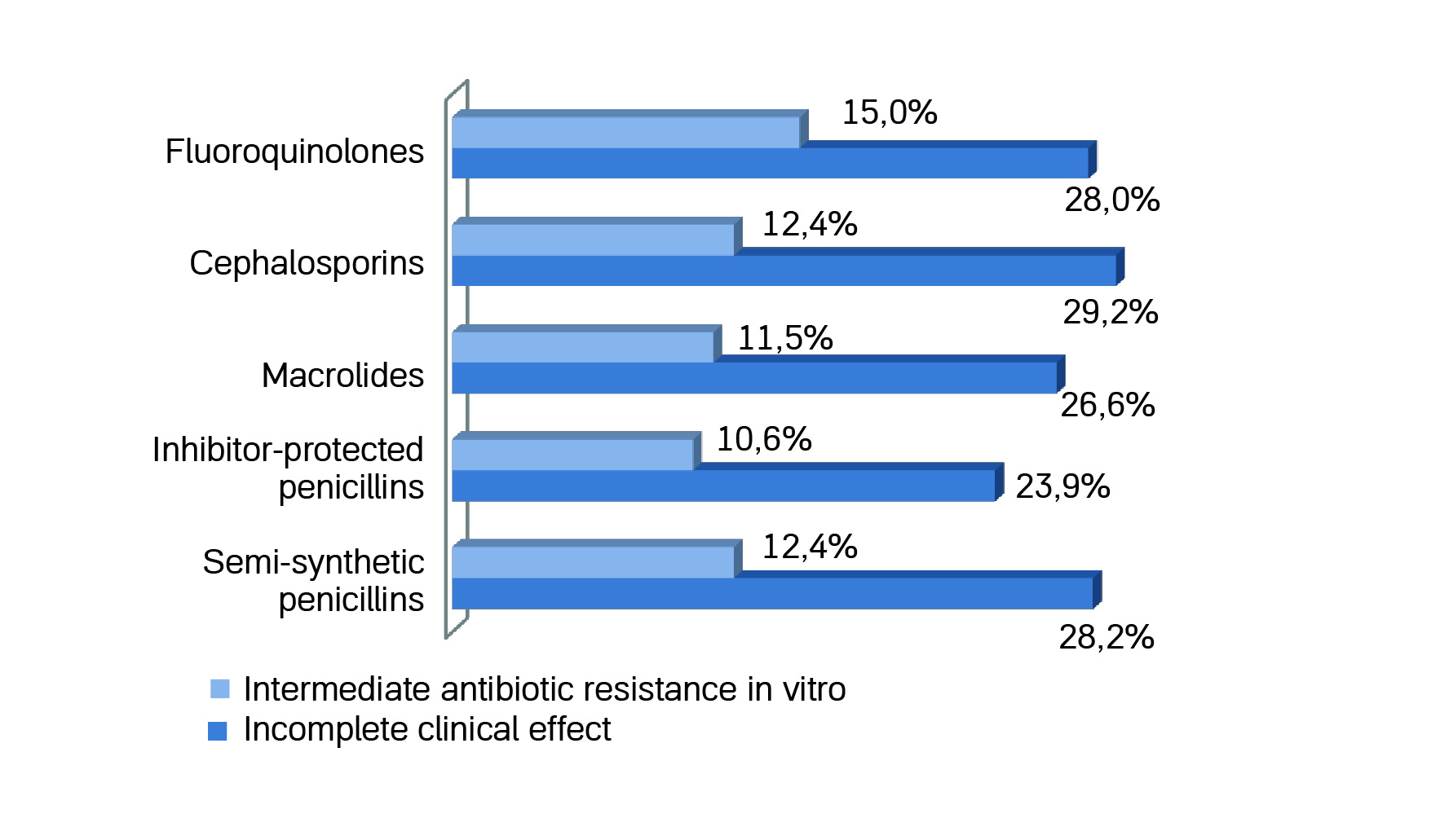 Figure 3. Comparative analysis of intermediate inhibition zones for S. pyogenes in vitro and absent or incomplete clinical effects of antibacterial agents in the treatment of chronic tonsillitis exacerbations (simple and toxic-allergic grade I forms) in patients.