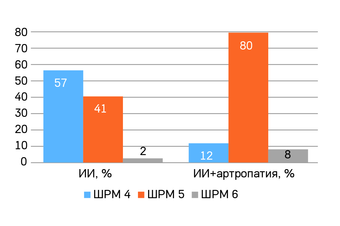 Анализ структуры ШРМ показал, что степень ограничения способности к самообслуживанию среди больных с артропатией была более выражена по сравнению с основной выборкой. Так, среди больных с артропатией в два раза был выше уровень ШРМ 5 баллов – 30 (80%, р = 0,005) по сравнению с основной выборкой больных, а ШРМ 4 балла – всего у 4 человек (12%, р = 0,04), ШРМ 6 баллов – у 2 человек (8%). Данные представлены на рисунке 3.