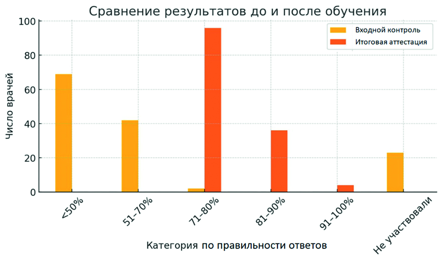 В ходе проведения входного контроля меньше 50% правильных ответов дали 69 обучающихся, 51–70% – 42 врача и 70–80% – 2 обучающихся, и еще 23 обучающихся не приняли участие во входном тестировании. В ходе итоговой аттестации по обучающей программе все обучающиеся показали сравнительно высокий уровень компетенций при выполнении тестовых заданий: 70–80% правильных ответов дали 96 обучающихся, 81–90% – 36 человек, 91–100% – 4 человека. Как минимум на один контрольный вопрос правильно ответили 42 обучающихся, на два – 85 и на все три вопроса – 9 врачей. Диаграмма сравнения результатов входного контроля и итоговой аттестации представлена на рисунке 1.