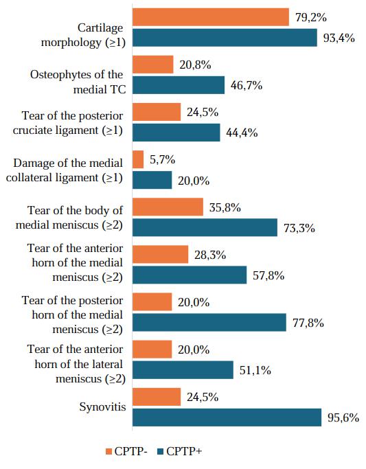 After 12 months of follow-up, the differences in the MRI findings between the CPTP+ and CPTP- groups became more noticeable. Statistically significant difference was registered in such parameters as cartilage morphology, osteophytes of the medial TC, damage of the posterior cruciate and medial collateral ligaments, tear of the body, anterior and posterior horn of the medial meniscus, tear of the anterior horn of the lateral meniscus, positive synovitis status (Fig. 1).