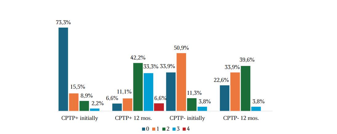It is to be mentioned that while the initial changes in the cartilage structure were more pronounced in the non-CPTP group (due to minimal changes, grade1), by the 12th month the situation changed: the cartilage deterioration was seen more frequently and in more severe forms in the CPTP+ group (Fig. 2).