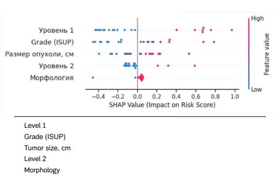 In is noteworthy that according to SHAP-analysis the influence of level I thrombosis was even more pronounced than that of level II. This may reflect the statistical peculiarities of the specific sample: in this study, there were significantly less patients with level II (n=16), which might have resulted in the decrease of stability of assessments in the training of the DeepSurv model. Besides, tumors with level II thrombosis could be combined, in individual cases, with less aggressive morphological characteristics (e.g., smaller size or lower ISUP grade), which the neural network could have considered in a cumulative way and partially compensate the total risk.