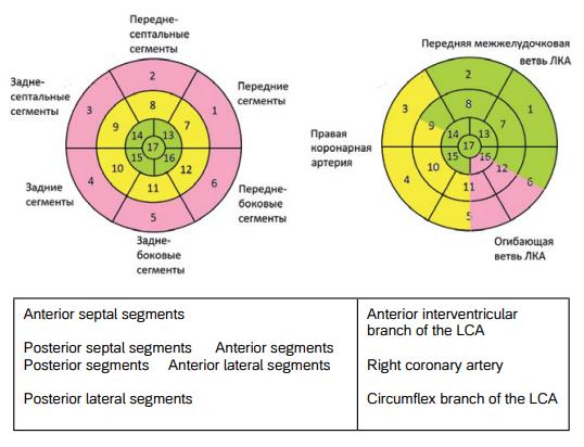 Рисунок 1. Схема сегментарного деления и кровоснабжения сегментов левого желудочка. Слева – схема сегментарного деления левого желудочка (розовый цвет – базальный уровень, желтый – медиальный, зеленый – апикальный). Справа – схема кровоснабжения левого желудочка (ЛКА – левая коронарная артерия).