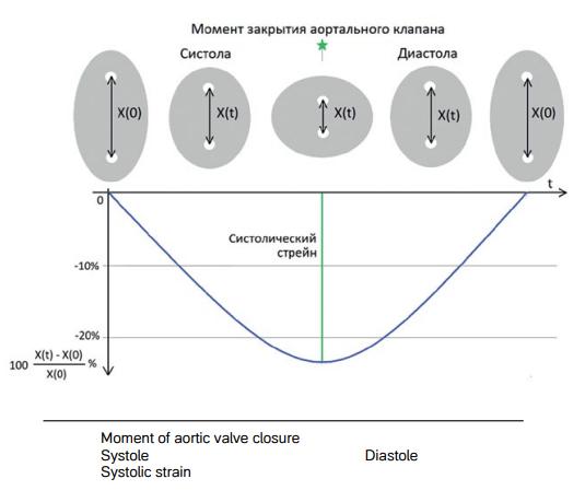 Рисунок 2. Изменение расстояния между близлежащими точками миокарда и показателя продольной систолической деформации (продольного систолического стрейна) на протяжении кардиоцикла (схема).