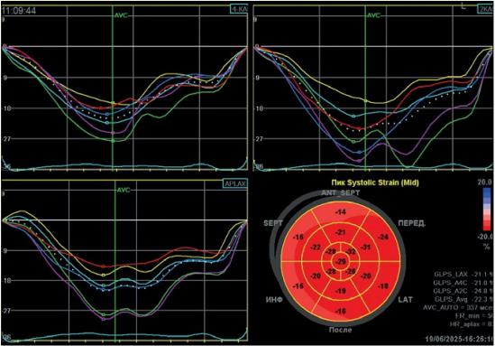 Figure 3. Results of measuring the longitudinal systolic strain of the left ventricle using the speckle-tracking echocardiography method. Graphs of strain changes throughout the cardiac cycle in all 17 segments of the left ventricle are presented. Strain values at the moment of aortic valve closure are shown on the color map.