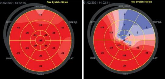 Figure 4. Left ventricular strain in a patient with hemodynamically significant stenosis of the anterior interventricular branch (LAD) of the left coronary artery before (left) and after (right) dosed physical exercise. Before the exercise, the average longitudinal strain value in the blood supply zone of the LAD is -22%, after the exercise – +2.1%. A positive value of systolic longitudinal strain indicates that the myocardium is stretched during systole, i.e. is in the state of dyskinesis.