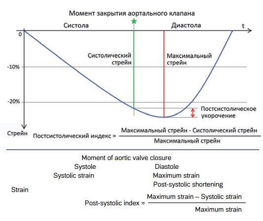 According to P. Brainin et al. (2019) [37], in healthy individuals PSS is registered on average in 80% segments of the left ventricle. At the same time, the median PSS is 0.4% [interquartile range 0.2; 0.8%], and the median PSI is 2% [0.7; 4.8%]. The mechanism of physiological PSS is related to the measurement of geometry of the left ventricle at the stage of isovolumic relaxation, i.e. in the period from the closure of aortic valve to the opening of the mitral valve. At this stage, the cavity of the left ventricle turns from elongated on the longitudinal axis to near spherical in shape. Singe the surface area of a sphere is less than the area of any non-spherical body of the same volume, the area of the myocardium surrounding the cavity of the left ventricle and the distance between its neighboring points decrease. Therefore, the physiological PSS is shortening, not the contraction, of the myocardium.