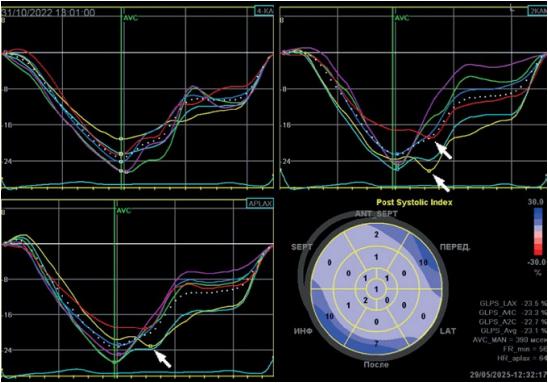 Figure 6. Results of calculation of the postsystolic index. The graphs of strain changes in 17 segments of the left ventricle during the cardiac cycle are presented. The systolic longitudinal strain corresponds to the point of intersection of the graph with the vertical line AVC (aortic valve closure), reflecting the moment of closure of the aortic valve. Arrows indicate the maximum longitudinal strain recorded after the completion of systole. Segments in which postsystolic shortening is recorded are highlighted in saturated blue on the color map.