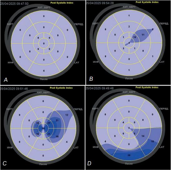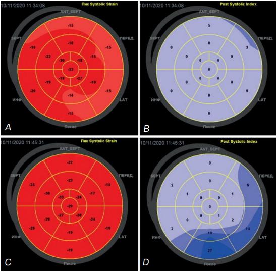 Thus, the question of development of pathologic PSS is directly related to the clinical interpretation of this phenomenon and, beyond doubt, is worthy of further research. This might be confirmed by results of speckle-tracking echocardiography shown in Fig. 8. In the patient with 95% stenosis of the circumflex branch of the LCA in the physical stress test, RCD (hypokinesia) in the basal and the medial posterior lateral segments were identified visually. At the same time, the values of the longitudinal systolic strain during the stress increased in all segments including the perfusion area of the affected artery (Fig. 8 A, C), which contradicts the results of visual assessment of the stress test and the CAG data. Yet the post-systolic index in the perfusion area of the circumflex branch of the LCA increased from 0 to 27% (Fig. 8 B, D), thus confirming the adequacy of visual assessment of the stress test. Based on the available knowledge of mechanisms of development and clinical significance of changes of indices of deformation under physical stress, it does not seem possible to explain the results of this study.
