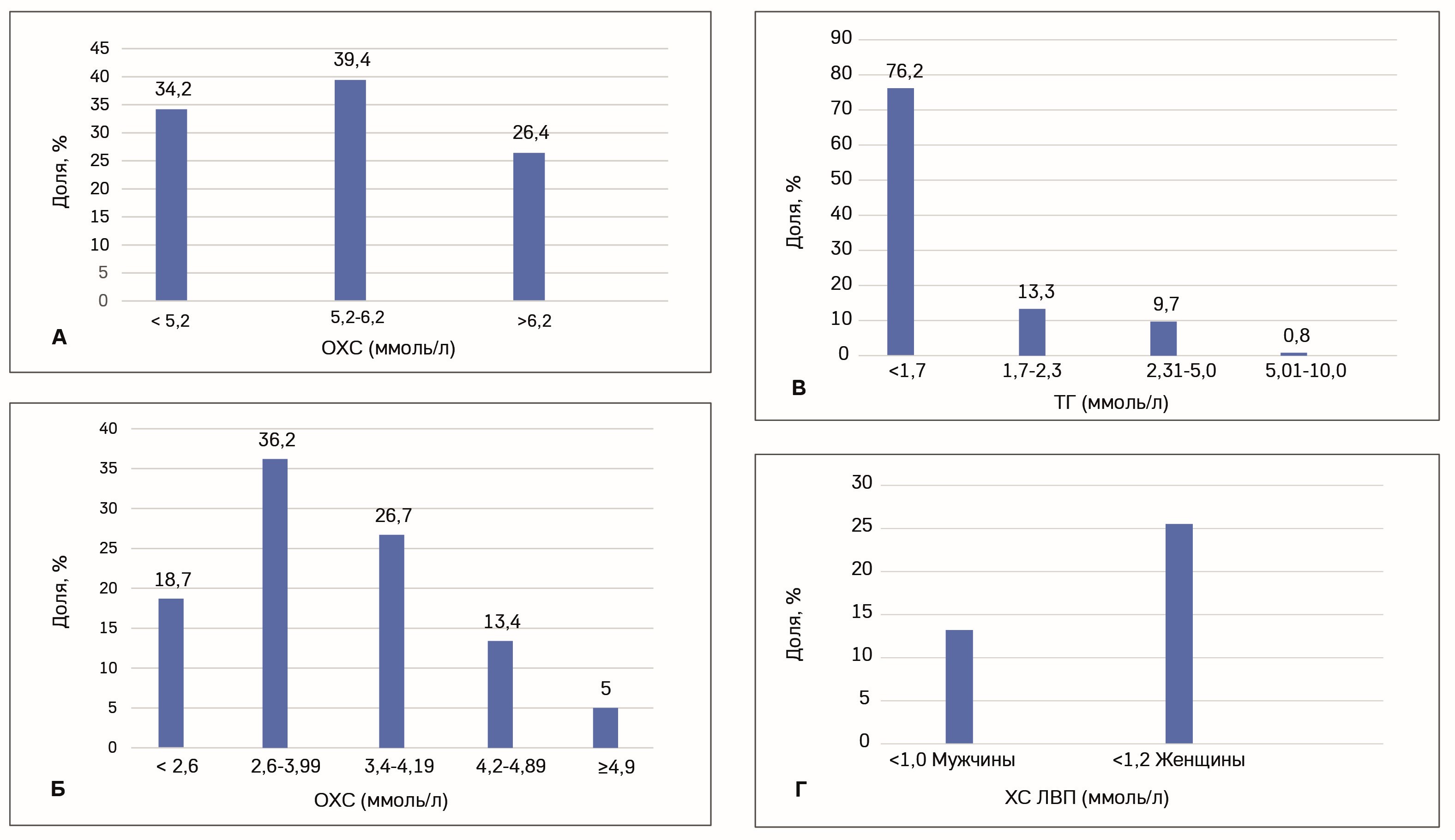 Рисунок 1. Распределение пациентов по уровню показателей липидного спектра. А – по уровню ОХС; Б – по уровню ХС ЛНП; В – по уровню ТГ; Г – доля пациентов с низким уровнем ХС ЛВП.