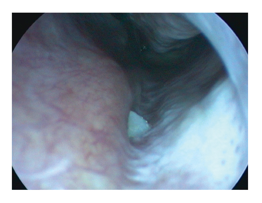 При поступлении в отделение оториноларингологии: общее состояние удовлетворительное. При эндоскопии полости носа после удаления слизи из общего носового хода слизистая оболочка левой половины носа розового цвета, умеренно отечная, в области дна полости носа слева в передних отделах с переходом на перегородку носа отмечается дефект диаметром 0,3 см слизистой оболочки с наличием беловатого твердого неподвижного выступающего образования (рисунок 1).