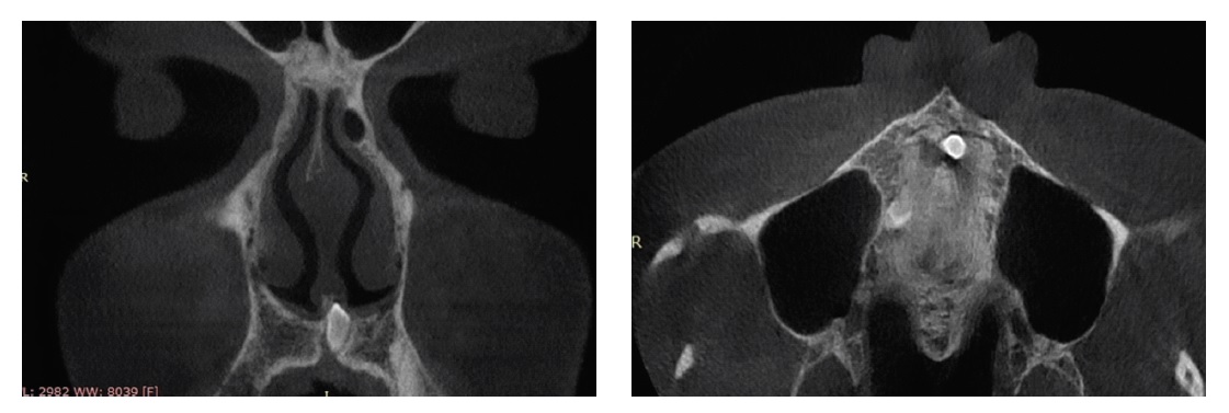 При осмотре полости рта: на верхней челюсти патологических изменений не выявлено. На компьютерной томограмме полости носа и околоносовых пазух (рисунки 2, 3) данных за патологию околоносовых пазух не выявлено, перегородка носа по средней линии, в альвеолярном отростке слева с переходом на дно полости носа отмечается ромбовидной формы образование костной плотности размером 3,6*2,7*8,5, костный канал не определяется (соответствует зубу).